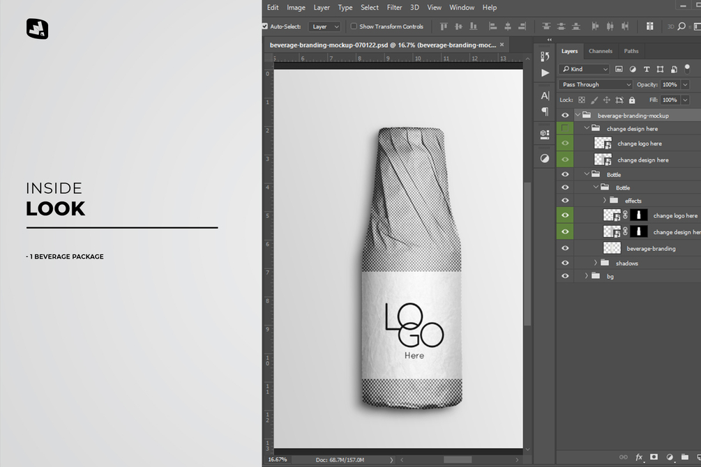 This beverage branding mockup is compatible with Photoshop CC and later versions.
