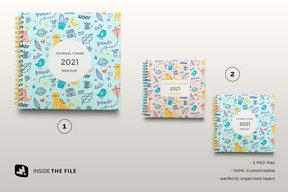 Journaling is a form of meditation and discipline. We all own journals to keep order in our lives. This top view spiral journal cover mockup is a simple relatable way to showcase any pattern or brand designs. This top view spiral journal cover mockup is perfect to add to your brand identity scene which can make your present come together beautifully. This journal cover mockup has versatile use as it also comes with a set of two. The base image is high-resolution and compact with highly organized color-coded layers. A detailed guide video is provided with the mockup to help you edit better and faster, which makes this spiral diary cover mockup a collective item.